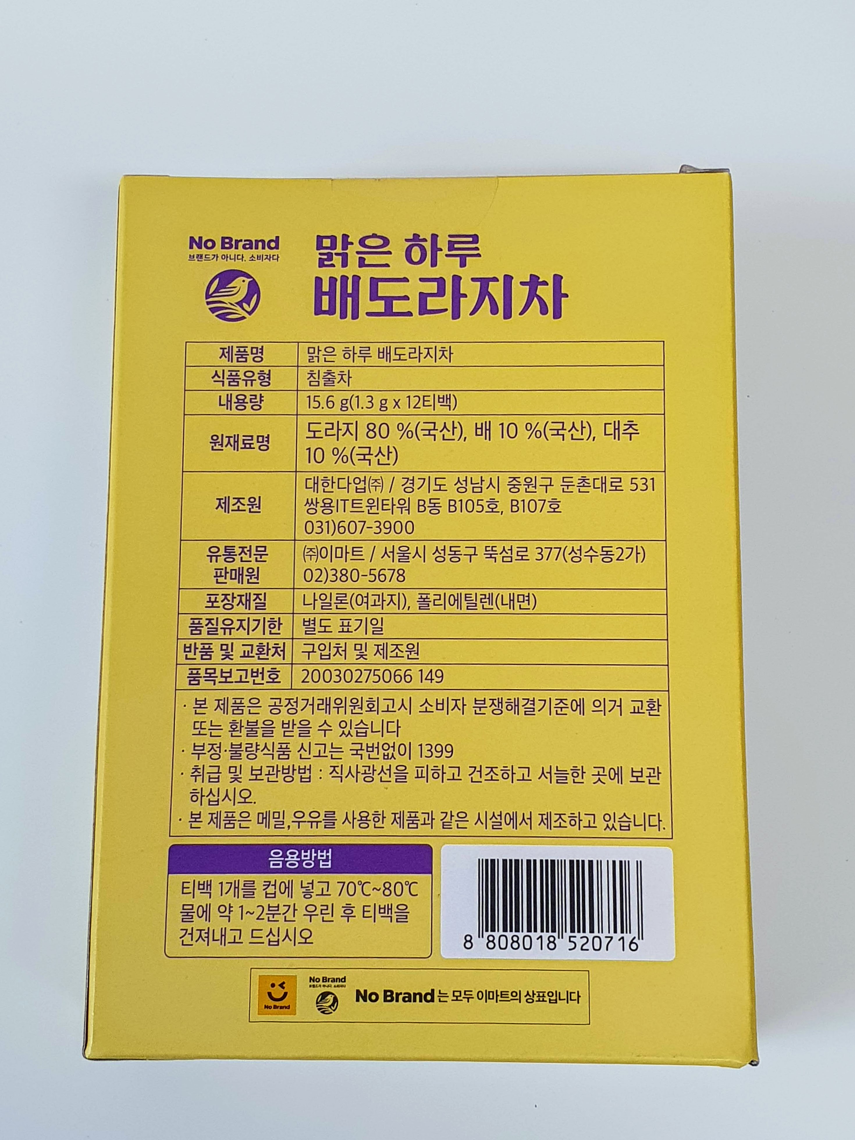 노브랜드 배도라지 차 박스 뒷면에는 제품 정보가 상세히 표기되어 있습니다.