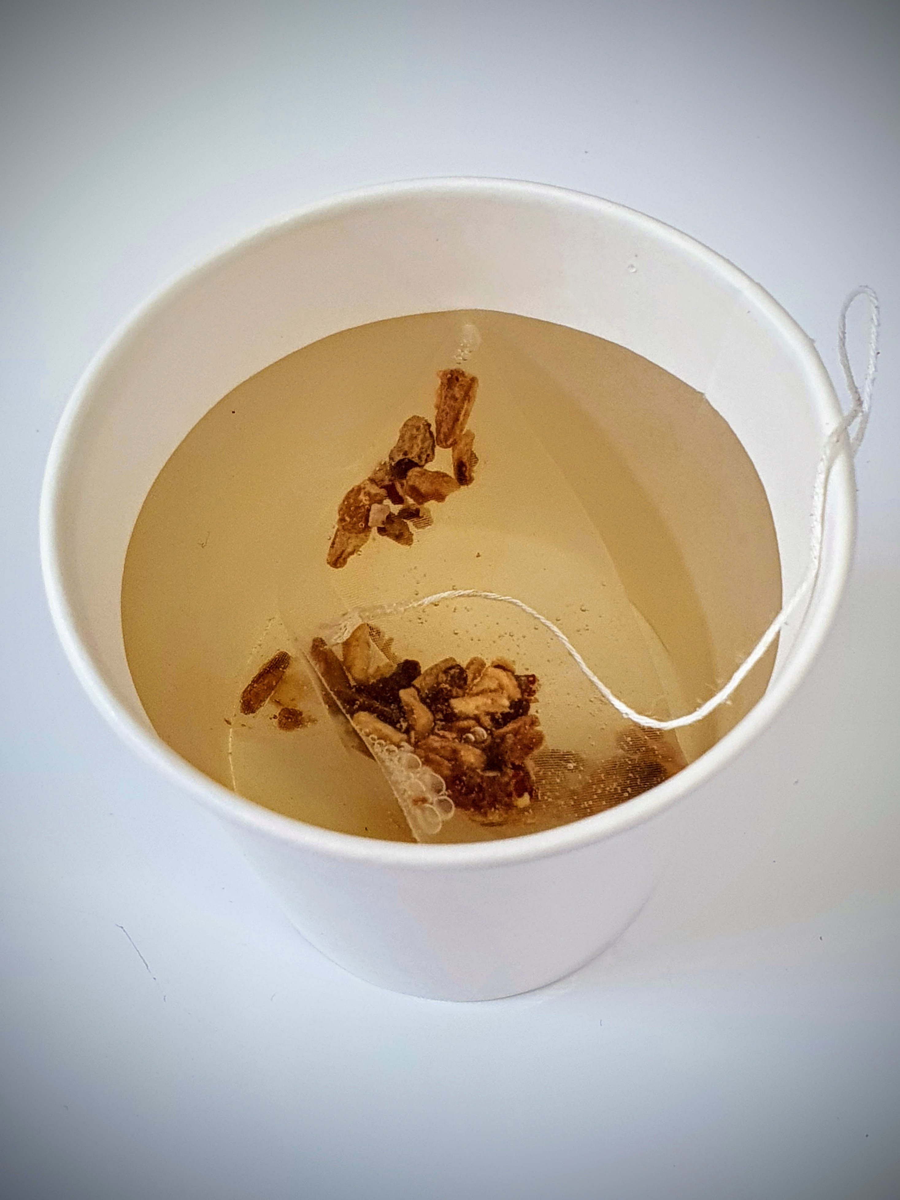 종이컵에 노브랜드 배도라지 차 티백을 넣고, 따뜻한 물을 부은 후 1~2분 정도가 지나자, 곧바로 물의 색이 노란색으로 변합니다.