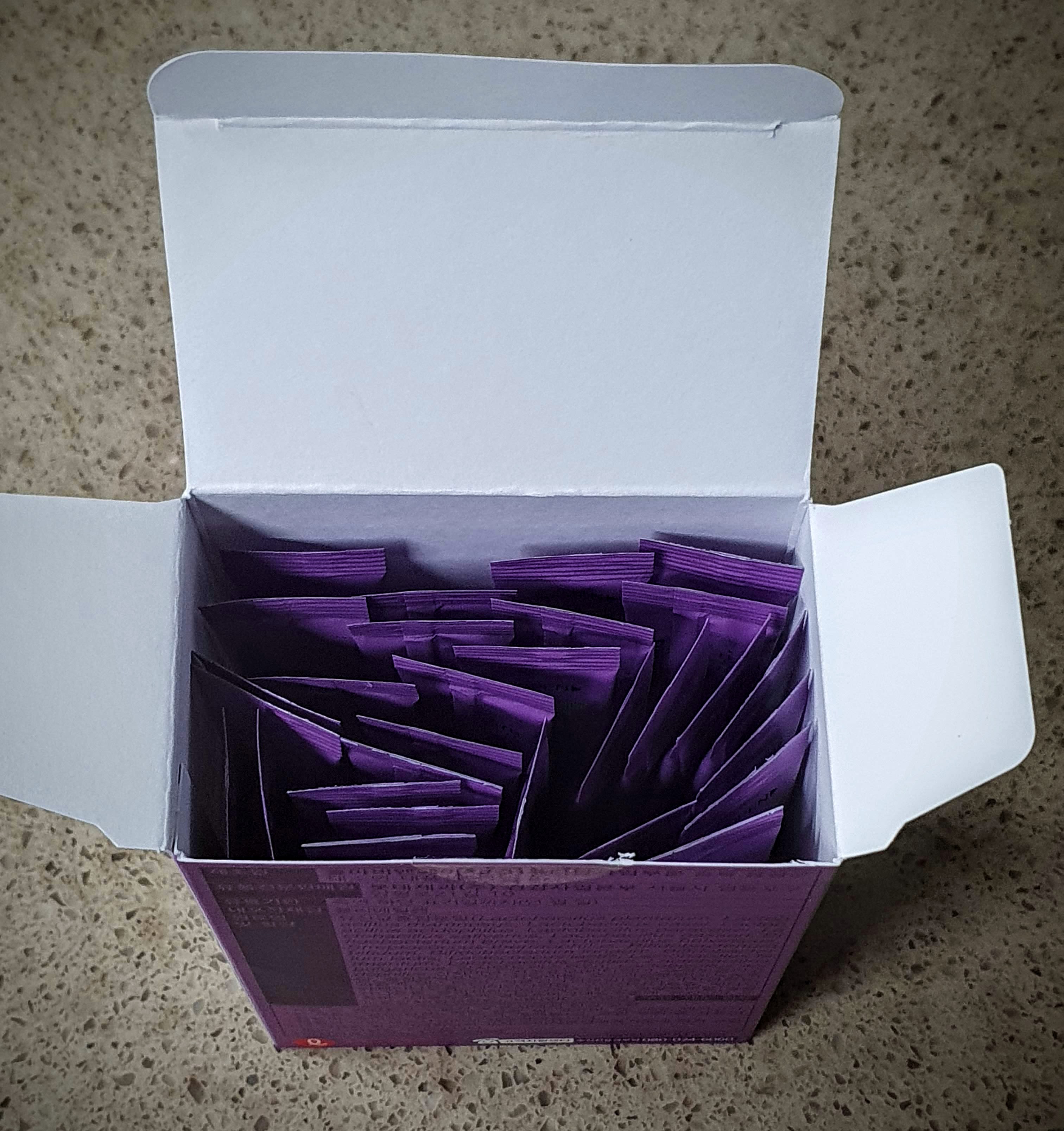 1박스는 60g으로, 2g 30포가 들어있습니다.
