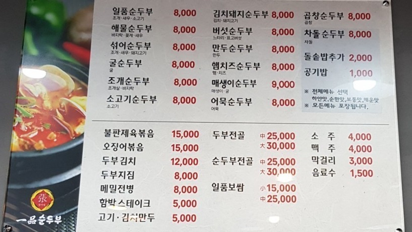 장가네 일품순두부의 메뉴는 여러 사이드 메뉴들도 있는데, 순두부가 주력 메뉴라서 그런지 순두부 종류가 상당히 많은 것을 보실 수 있습니다.