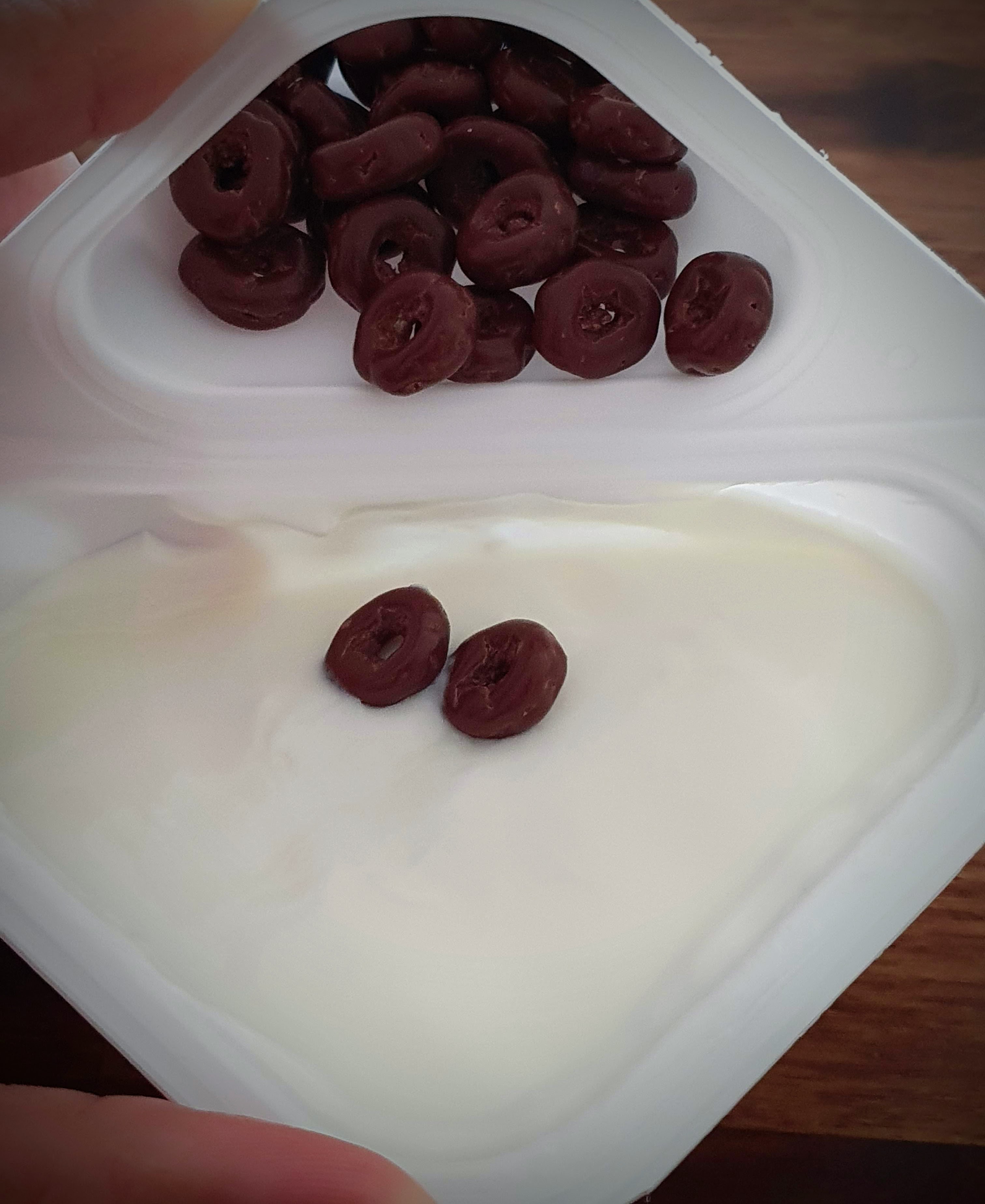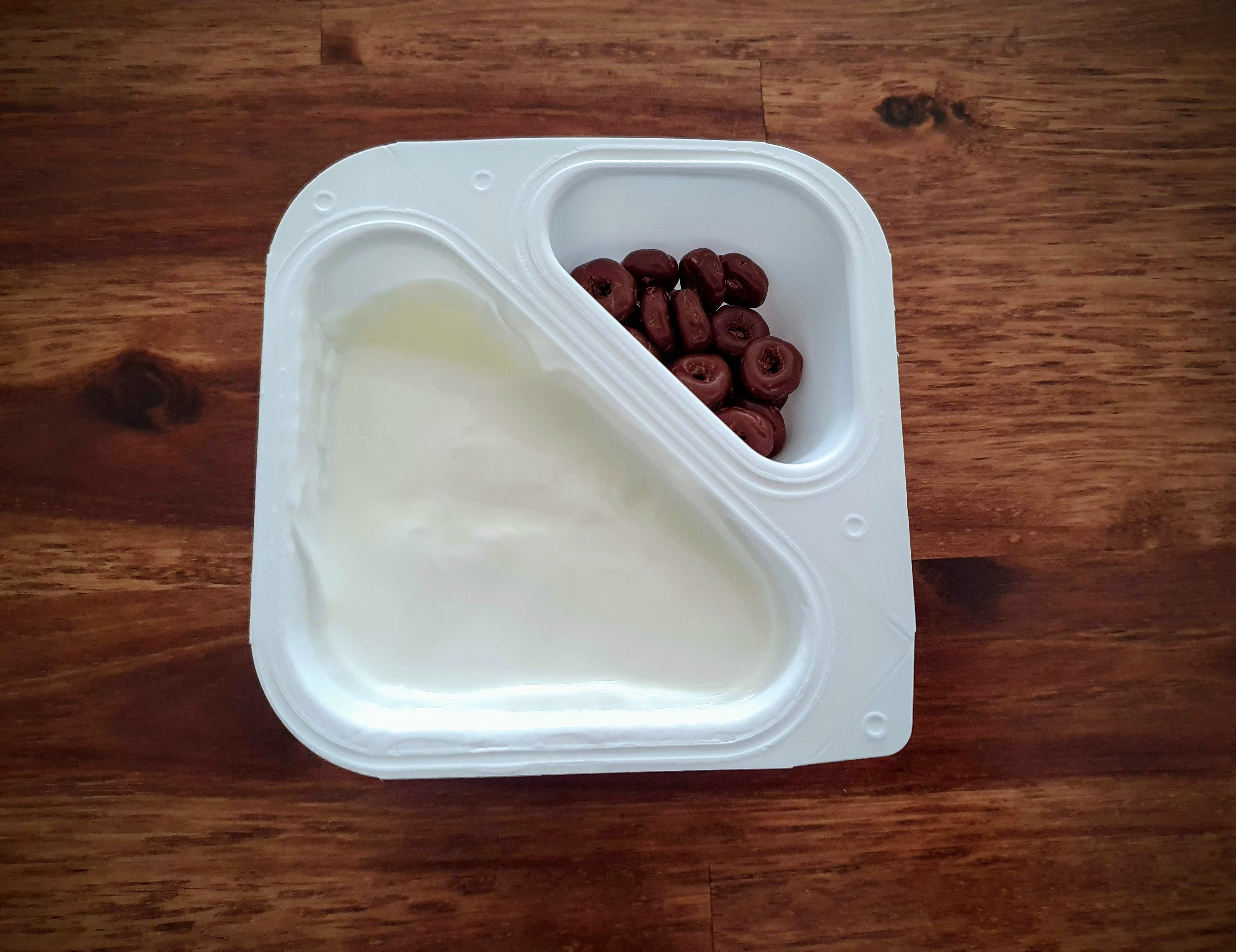 내용물을 보시면, 한쪽에는 플레인 요거트, 다른 쪽에는 초코링 토핑이 담겨 있는 모습이네요.