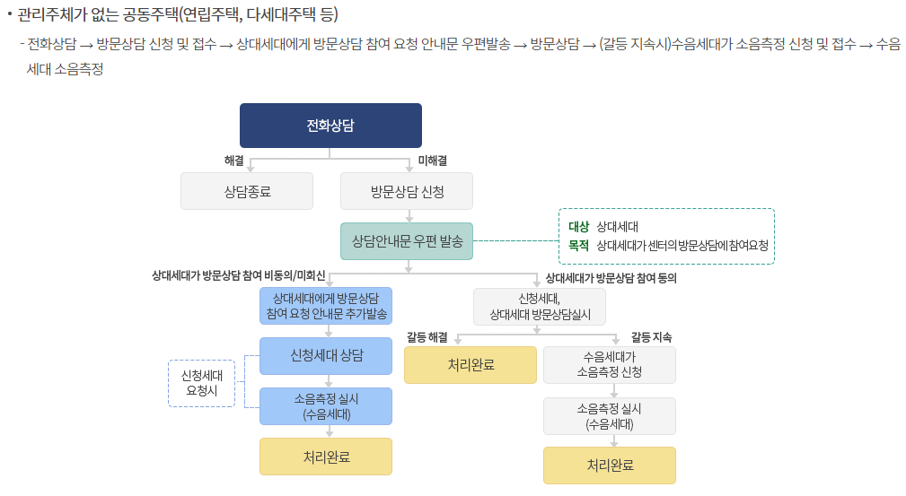 층간소음 이웃사이센터의 업무절차는 위의 표에도 나와 있듯이 전화상담→방문상담 신청 및 접수 → 관리주체에게 우선 상담 실시 요청 안내문 등기 발송(관리주체가 없는 경우 상대 세다에게 방문상담 참여 요청 안내문 우편발송) → (우선 상담 후, 갈등 지속 시) 관리주체가 대표로 현장진단 신청 및 접수 → 방문상담 → (갈등 지속 시) 수음 세대가 소음측정 신청 및 접수 → 수음 세대 소음측정으로 진행됩니다.