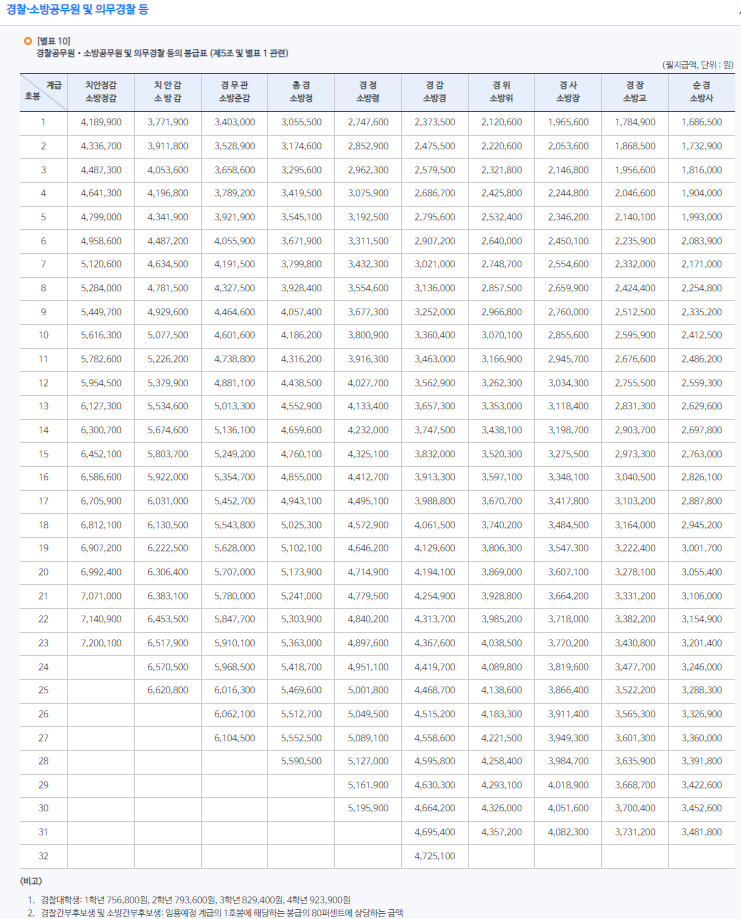 경찰·소방공무원및 의무경찰 등의 봉급표입니다.