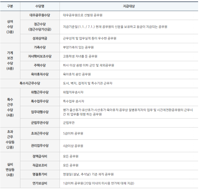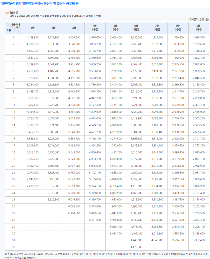 하지만, 직종 상관없이 공통적으로 받는 수당이 있고, 직종별, 직급이나, 직책에 따라서 다양한 종류의 수당이 지급되기 때문에 봉급표만으로 공무원 봉급을 판단하기는 어렵습니다.