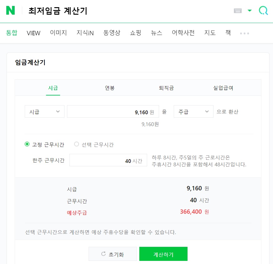 예를 들어 시급이 2022 최저임금 기준으로 9,160원이라고 보고 한주 근무 시간 40시간으로 계산을 하면 예상 주급이 366,400원임을 알 수 있습니다.