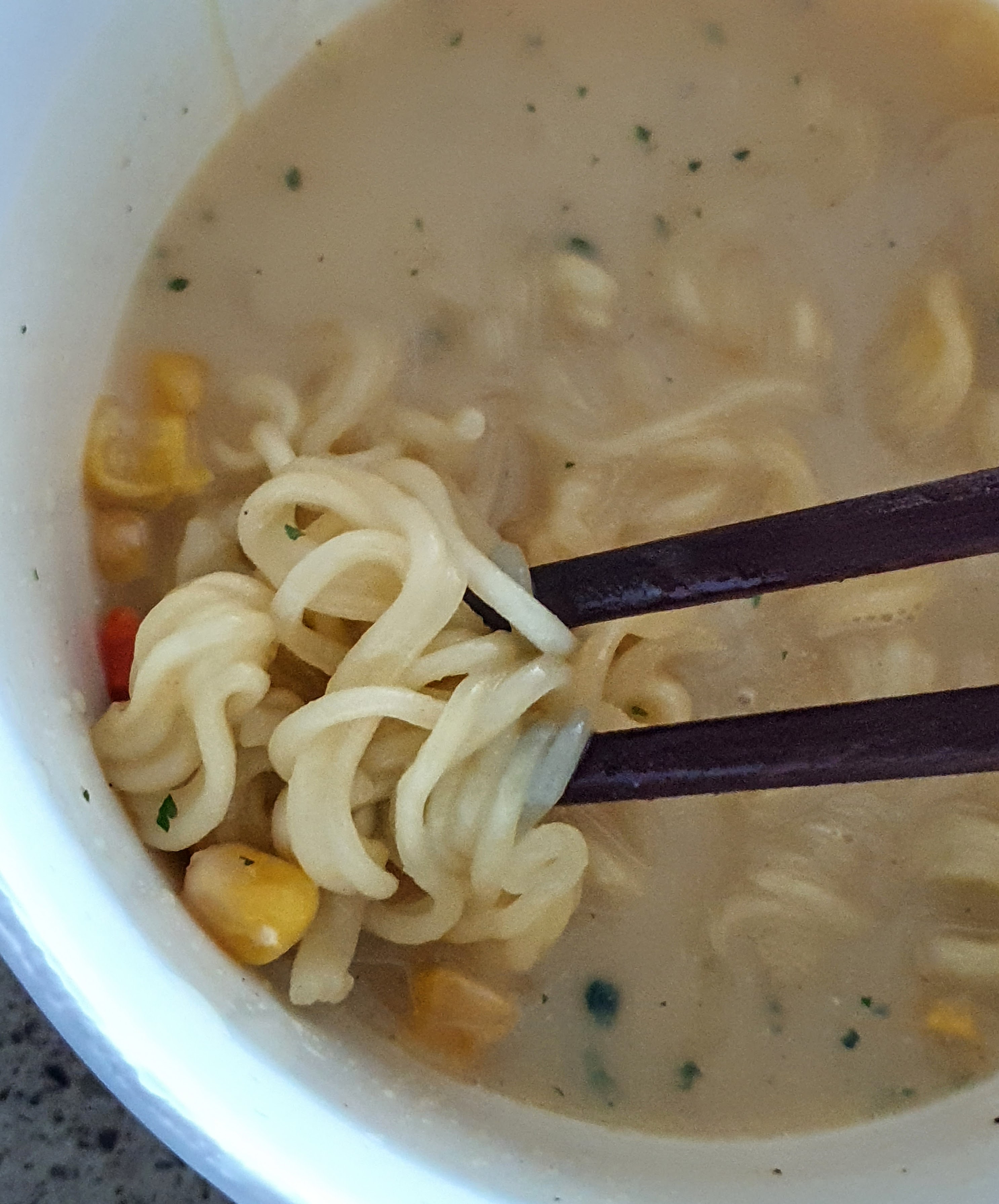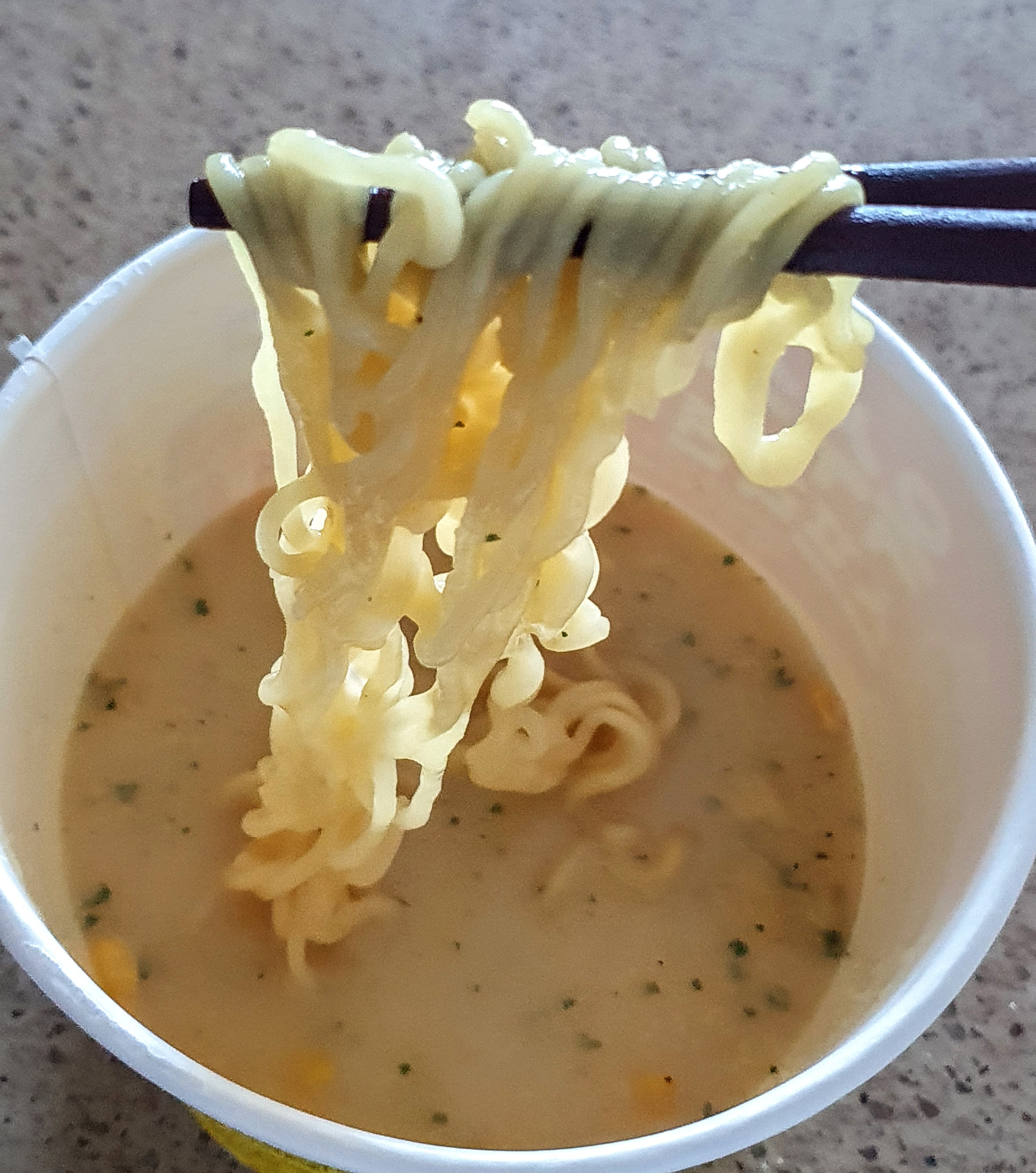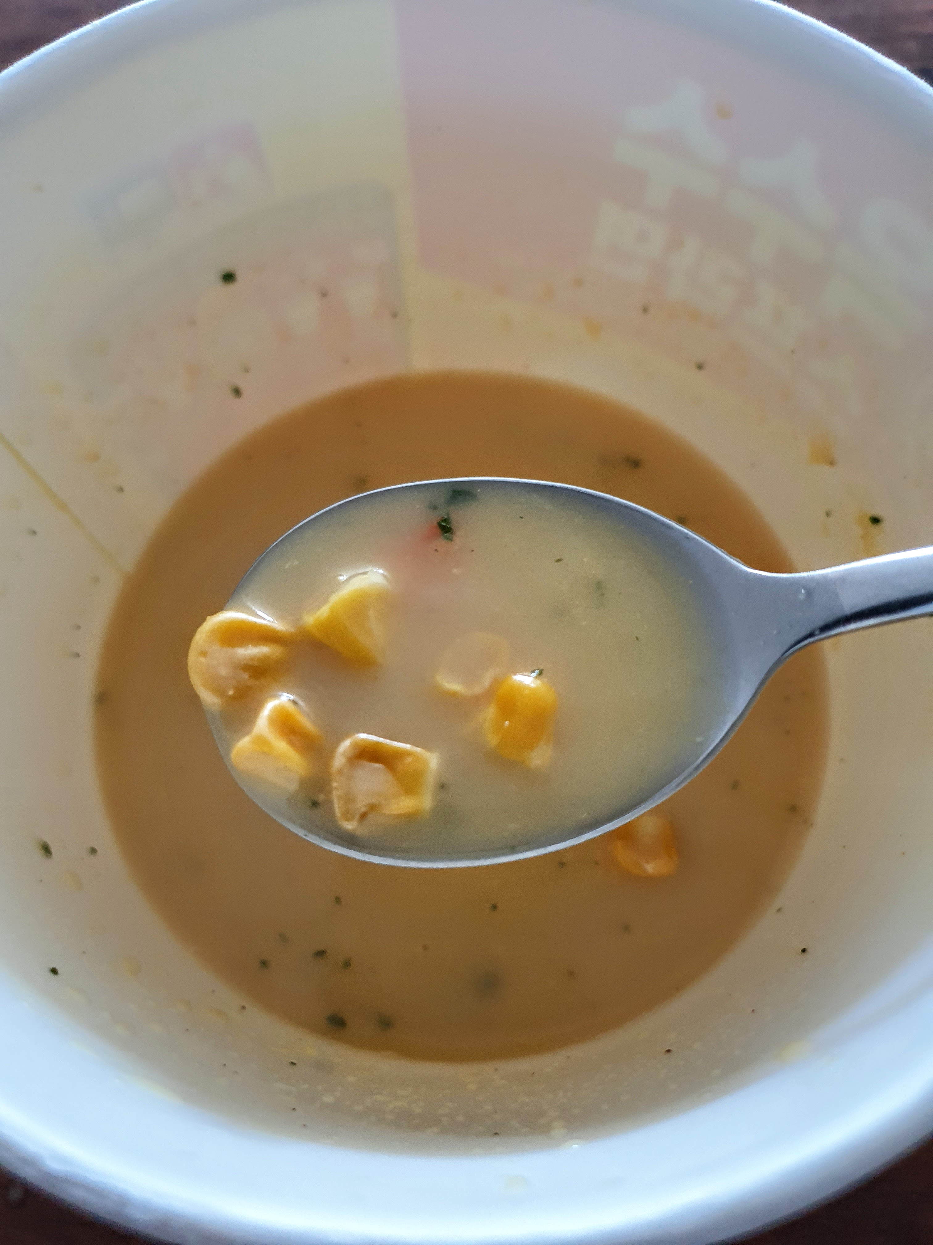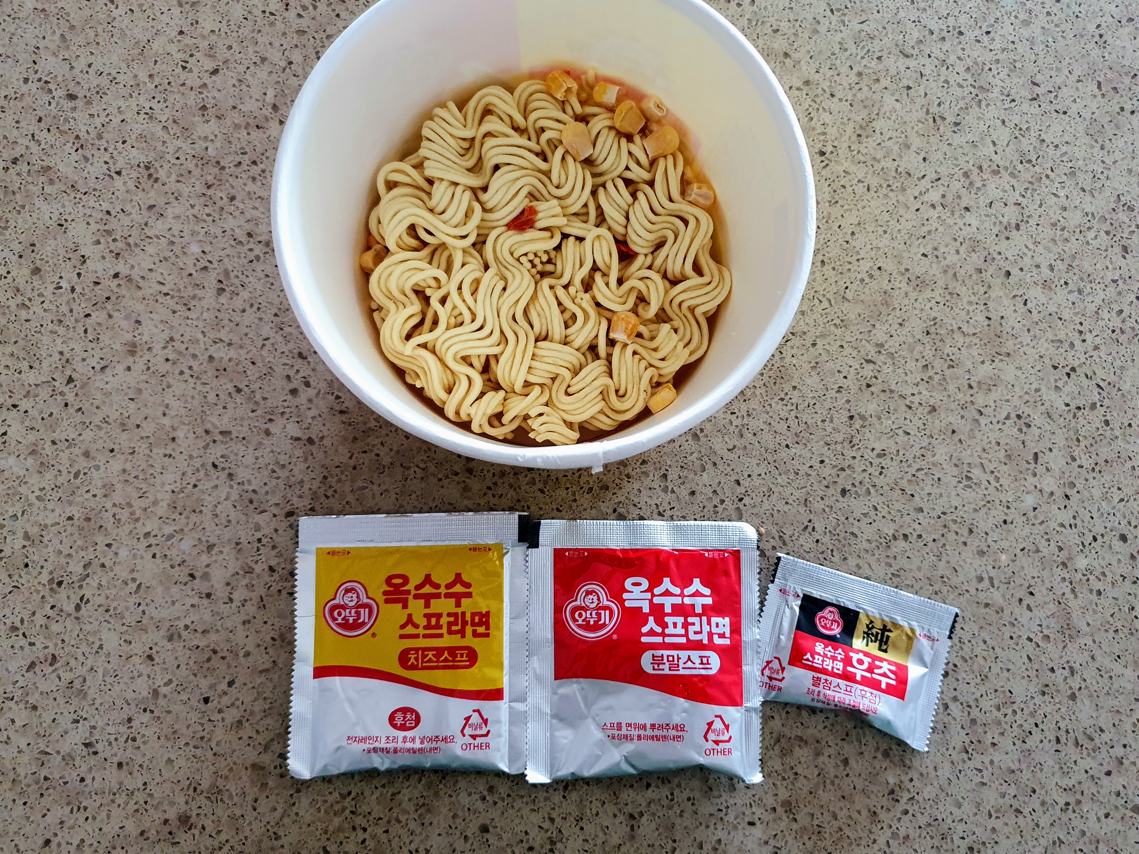 면발은 기존의 컵라면과 크게 다르지 않은데, 국물(스프)이 옥수수 스프에 치즈 스프와 함께 후추스프가 더 들어있어서 그런지 오뚜기 옥수수 스프보단 조금 더 풍미가 느껴지는 편이네요.