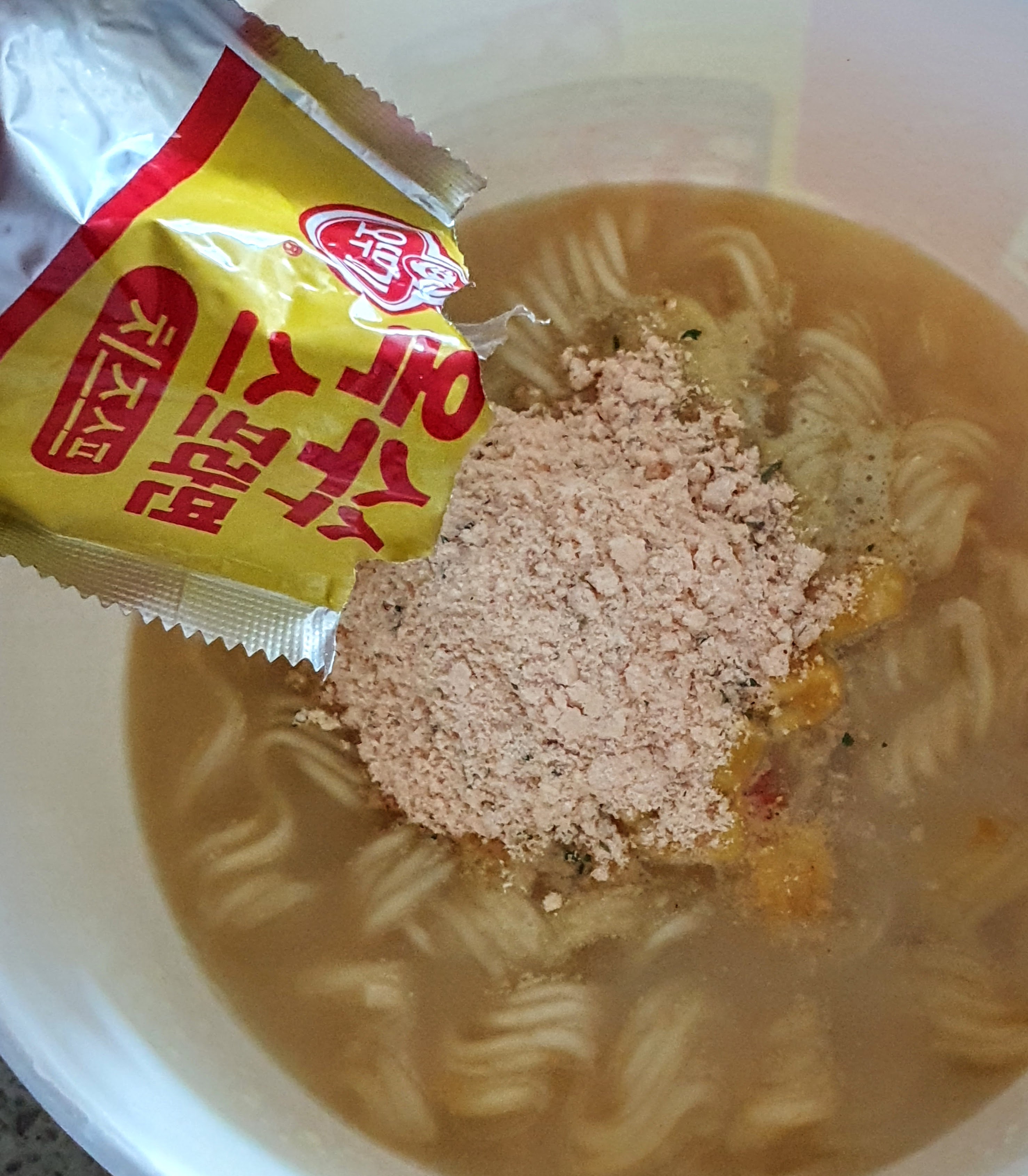 우선 오뚜기 옥수수 스프라면에 3종류의 스프 중에서 분말스프를 먼저 부어봤습니다.