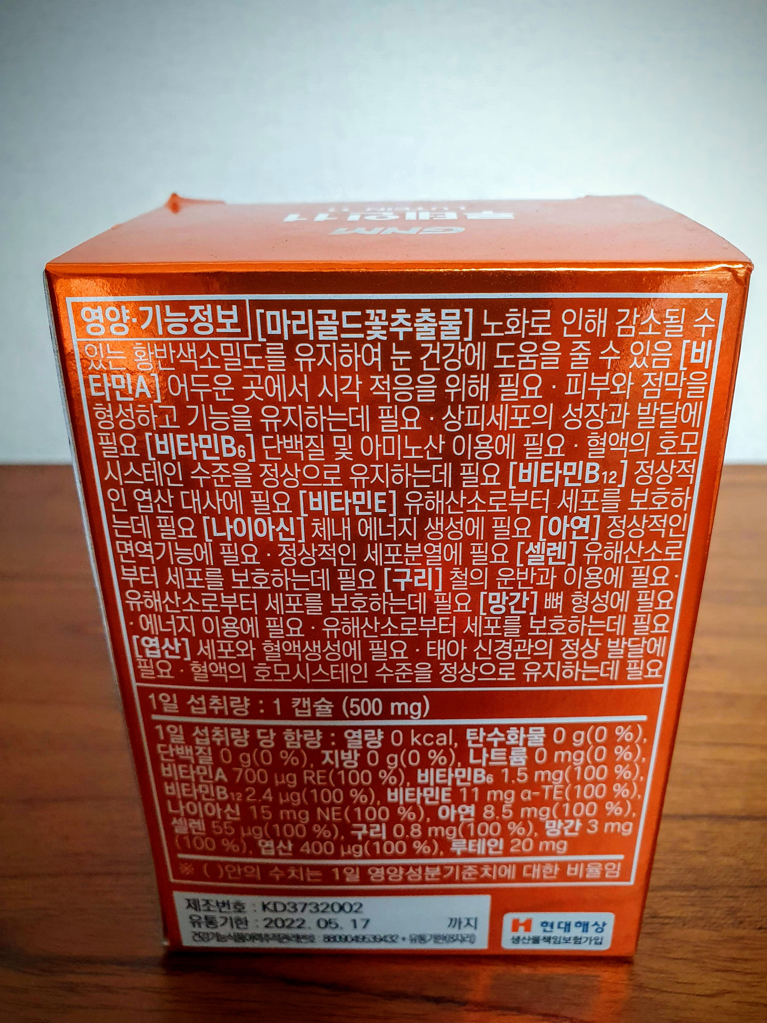 1 캡슐(500mg) 섭취 시 1일 섭취량 당 함량은 비타민A, 비타민B6, 비타민B12, 비타민E, 나이아신, 아연, 셀렌, 구리, 망간, 엽산 모두 100%이고, 루테인은 20mg이 들어 있습니다.