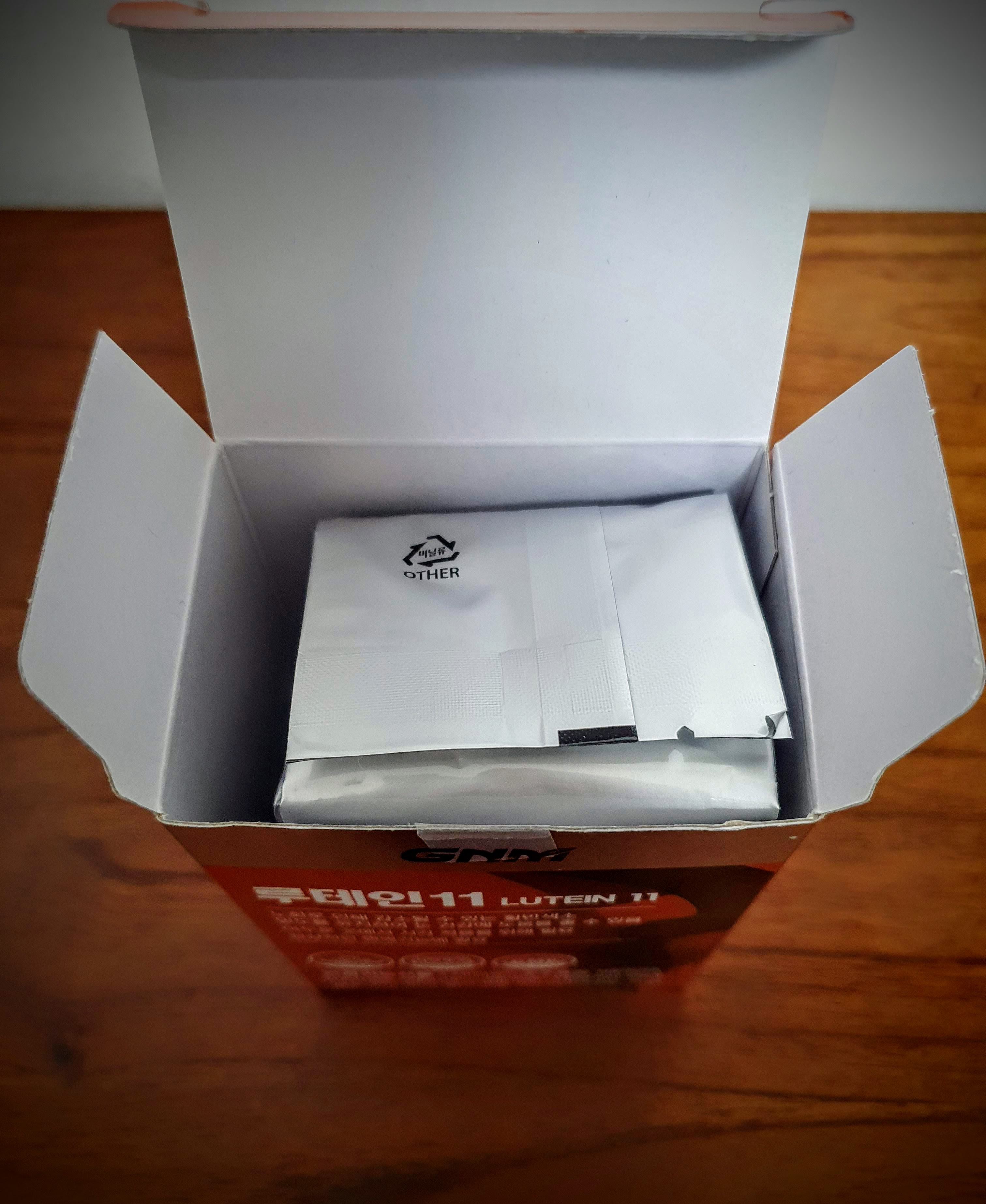 GNM 루테인11의 박스를 개봉해보면, 한번 더 포장이 되어 있고, 1박스 당 30 캡슐이 들어 있습니다.